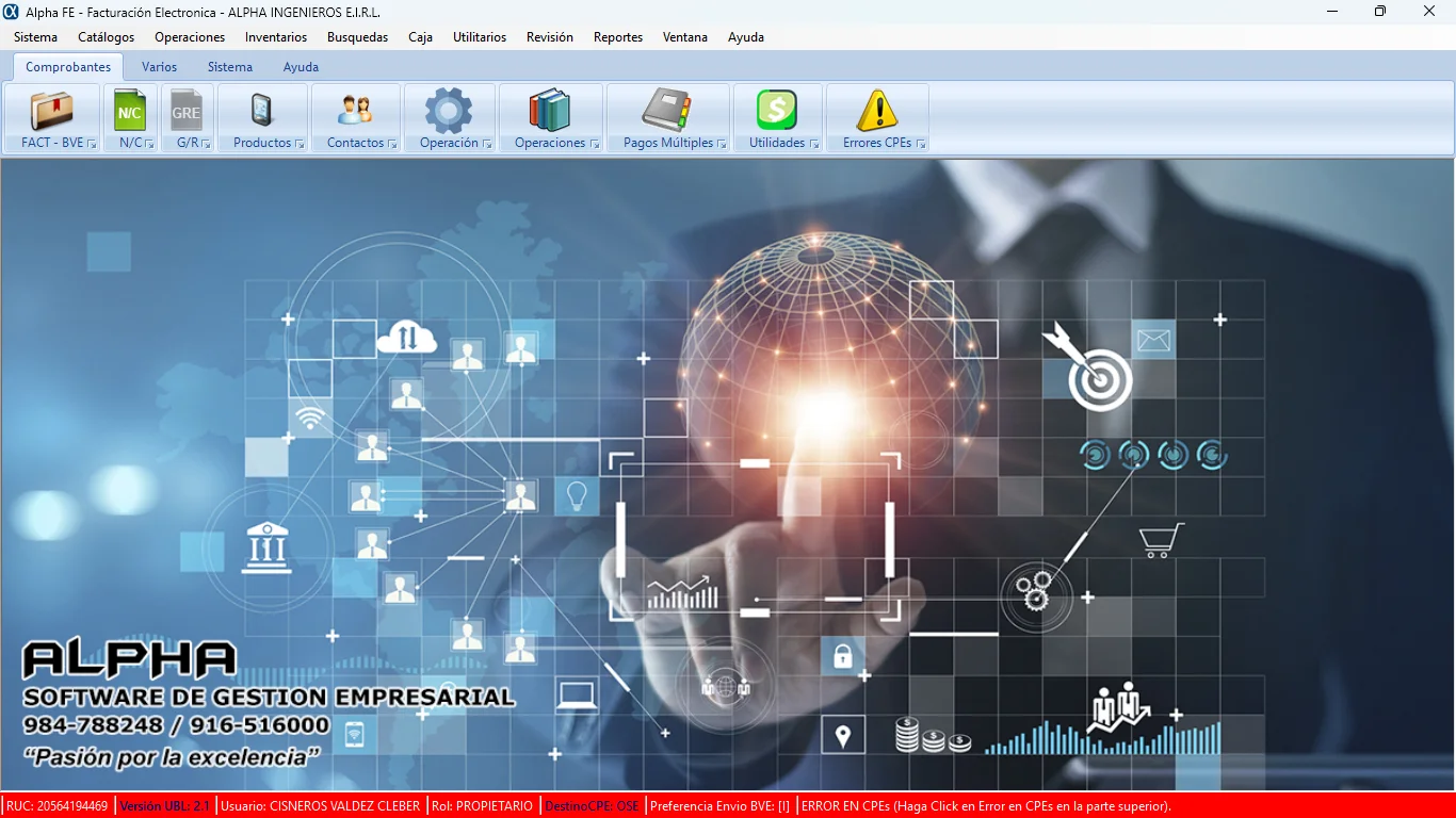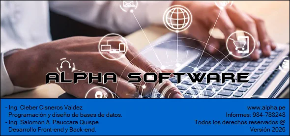 ALPHA es un software desarrollado para satisfacer las necesidades de automatización de actividades y procesos de su empresa como son la gestión de ventas, compras, control de almacén (control de stock), flujo de caja, generacion de comprobantes electronicos (factura, boleta, NC,ND), etc. La flexibilidad de ALPHA hace que el sistema se parametrice y se personalice para cubrir y desempeñarse de acuerdo a las necesidades propias de su empresa. La interfaz de ALPHA es de fácil aprendizaje y utilización y le da la posibilidad de hacer de su empresa mucho mas competitiva y eficiente en el mercado actual, el software tiene más de 20 años de desarrollo y evolución permanente, tiempo en el cual más de 200 empresas de la región decidieron utilizar Alpha con todas las ventajas y beneficios que esto conlleva.